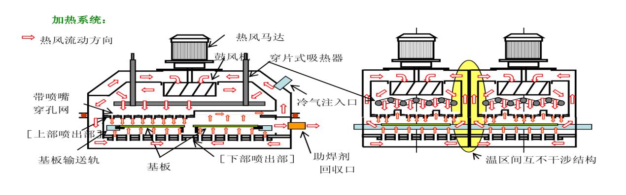 采用世界领先的热风循环技术,合理运用热风循环经过涡轮增压使得热风均稳;热效率循环使用率高 即节能又稳定,PCB大量通过时,其每一块PCB上的温度曲线与仅一块板通过时的温度曲线永远一致,加热的重复精度极高,非常适合无铅工艺中工艺空间较小的特点.(通过进口炉子技术改进) |